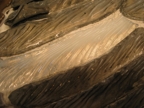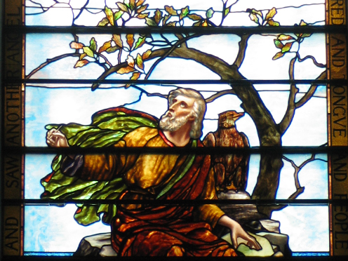 With these windows Tiffany perfected his technique known as drapery glass which is the folding of the glass over top of itself to get the layered effect that you see. The robes in the Ascension window for instance, are as much as 1-1/2" to 2" thick. Tiffany also added precious metals to the glass as well. For instance, the Apocalypse window, the window at the back of the sanctuary facing west, the blue in the water is sprinkled with silver, and the crowns and the wings of the angels are sprinkled with gold. These precious metals create an entirely different effect that makes the windows come to life. In the summer around 4 o’clock in the afternoon the water appears to move and ripple.